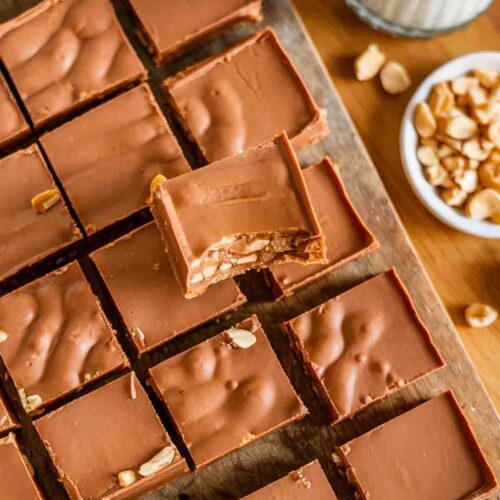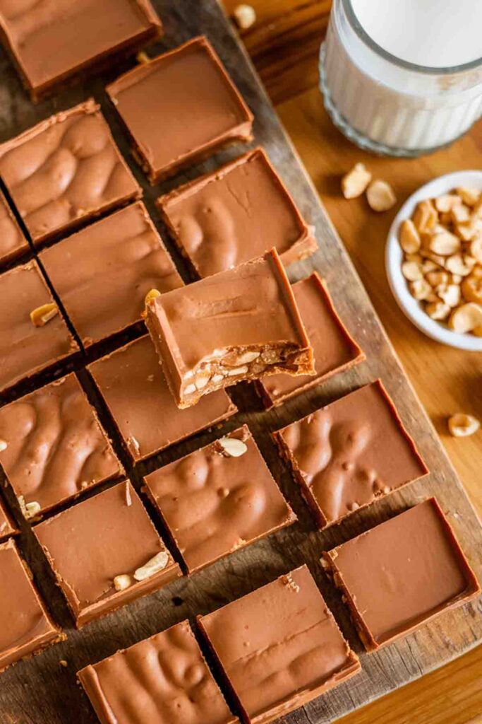 Pour the milk chocolate sauce over the cooled peanut butter nougat layer. Sprinkle chopped peanuts on top. Allow the candy to set in the refrigerator for at least 2 hours before cutting into bars.